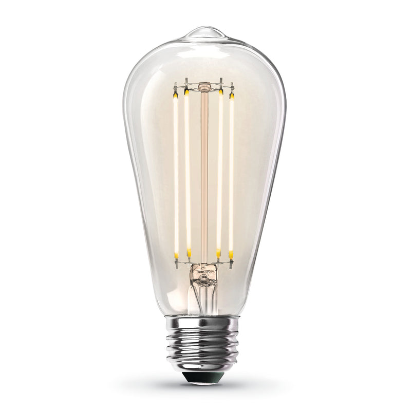 Combine the vintage glass filament lighting look and feel with the advantages of modern LED technology with this stylish light bulb from Feit Electric. Energy efficient LEDs replace a 100-watt incandescent, producing a 2700K Soft White glow that gives the home a cozy feel. A stylish ST19 shape with vertical filament strips wrapped in clear glass housing is ideal for decorative lighting fixtures and will enhance the décor of any room.