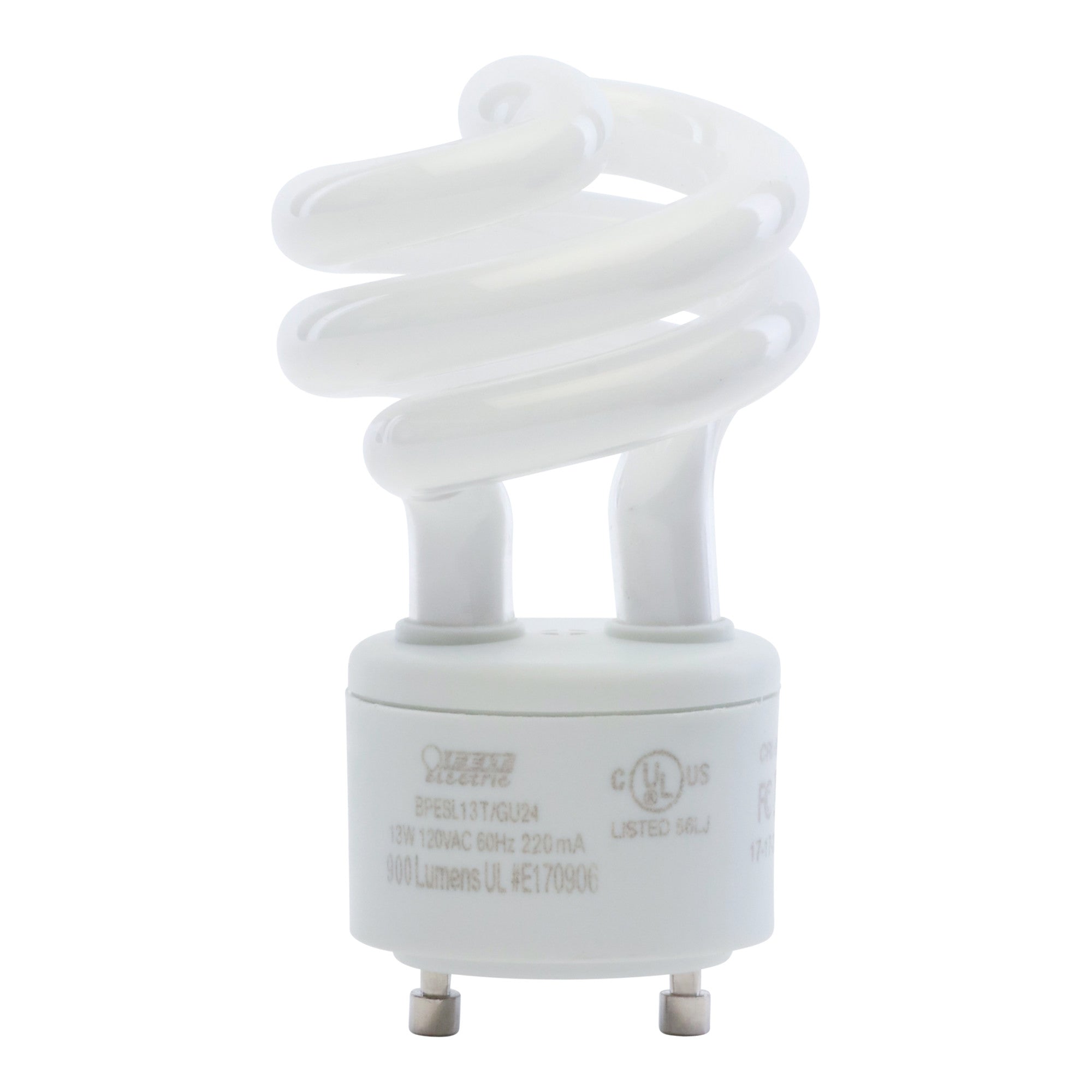 The Feit Electric BPESL13T/GU24 13W Mini Twist GU24 Base CFL 2700K Soft White light is non-dimmable and replaces 60-watt incandescent bulbs. It produces a similar light output of 900 lumens using up to 78% less energy than a standard incandescent light bulb. This compact fluorescent light is ideal for ceiling fans, chandeliers, table lamps, or wall scones. Feit Electric CFL bulbs have a relatively cool running performance, an average life of 10,000 hours/9.1 years, and are RoHS / FCC compliant. Choose a dependable general purpose lighting bulb for residential or commercial applications.