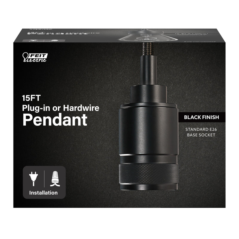 Make a statement with the sleek 15-Foot Black Pendant fixture from Feit Electric. Gorgeous pendant lighting is no longer limited to one installation option. This versatile pendant works as both a plug-in and hardwire fixture. It comes in a Matte Black finish with a matching 15-foot woven black cord and rocker switch. Its premium turn-of-the-century design and texture enhance any space, from homes to commercial locations. Hang it from the ceiling alone, or group multiple pendants to add a refined touch to dining rooms, living rooms, or kitchens. Pair it with vintage-style bulbs for an industrial or midcentury feel in hotel lobbies or offices. Pair it with smart bulbs for modern connectivity. The subtle design fits in with any décor.