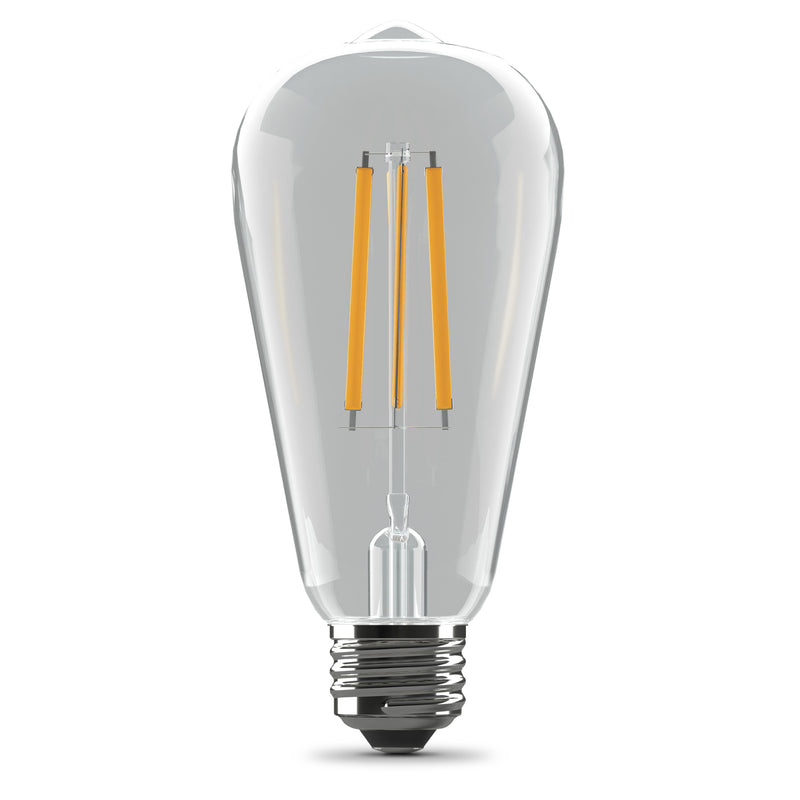 Combine the traditional look and feel of Edison lighting with the advantages of modern LED technology with the ST19100/CL/927CA/4 decorative filament LED light bulb from Feit Electric. This dimmable 2700K Soft White light produces 1500 lumens using 15 watts of electricity - saving up to 85% in energy costs over an equivalent 100-watt incandescent. A stylish tapered look with an exposed filament wrapped in glass housing is ideal for decorative lighting fixtures. The Enhance® high Color Rendering Index (CRI) of 90 ensures accurate color representation, bringing out the true hues of your surroundings.