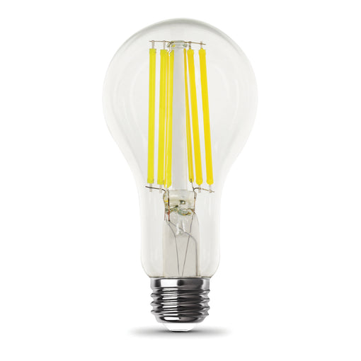 Enjoy all the benefits of advanced LED energy-saving technology with a decorative A-shape LED light bulb from Feit Electric. Replacing a 150-watt incandescent light, this ultra-bright bulb produces 2605 lumens of 3000K Bright White light while using just 18 watts of electricity - saving up to 88% in energy costs. A stylish design with clear glass and an exposed filament instantly livens up the décor of any room. These fully dimmable filament LED bulbs have an average life of 15,000 hours/13 years, are RoHS compliant, and are 100% mercury free. Choose a dependable decorative bulb to brighten your home.