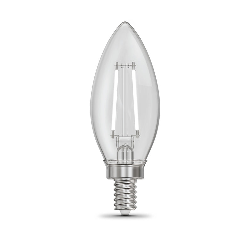 Upgrade your lighting to Feit Electric's elegant Exposed White Filament LED Light Bulbs for a fresh take on decorative bulbs. These first-of-their-kind white filament bulbs take a traditional torpedo tip bulb with exposed filament encased in clear glass and add lower-profile white filaments. Unlike yellow filaments, these blend into your current décor, for a timeless look that complements any room. They provide dimmable 5000K Daylight White glow ideal light for craft rooms, bathrooms, kitchens, laundry rooms, utility rooms, and anywhere you desire invigorating light. Their bluish-white light is perfect for reading, working on intricate projects, and seeing fine details. These bulbs can be utilized with any E12 Candelabra base such as chandeliers, wall sconces, pendant lights, and more. The BPCTC40950CAWFIL/2 emits 300 lumens while only using 3.3 watts of electricity, up to 91.8% less energy than equivalent 40-watt incandescent bulbs. A 90+ CRI infuses vibrance into your space, bringing out truer colors and more natural skin tones. Get up to 15,000 hours of life with an estimated energy cost of $0.40 per year. Create a stylish feel that instantly enhances any home or commercial space.