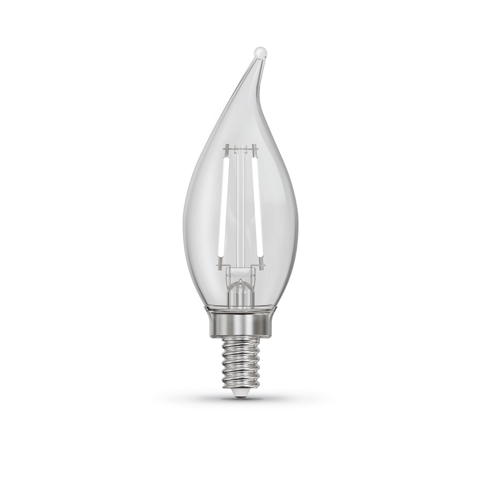 Upgrade your lighting to Feit Electric’s elegant Exposed White Filament LED Light Bulbs for a fresh take on decorative bulbs. These first-of-their-kind white filament bulbs take a traditional flame tip bulb with exposed filament encased in clear glass and add lower-profile white filaments. Unlike yellow filaments, these blend into your current décor, for a timeless look that complements any room. Their dimmable 2700K Soft White glow is ideal for creating a relaxing and comfortable atmosphere, with no harsh glare. These bulbs can be utilized with any E12 Candelabra base such as chandeliers, wall sconces, pendant lights, and more. The CFC40927CAWFILHDRP/3 emits 300 lumens while only using 3.3 watts of electricity, up to 91.8% less energy than equivalent 40-watt incandescent bulbs. A 90+ CRI infuses vibrance into your space, bringing out truer colors and more natural skin tones. Get up to 15,000 hours of life with an estimated energy cost of $0.40 per year. Create a stylish feel that instantly enhances any home or commercial space.