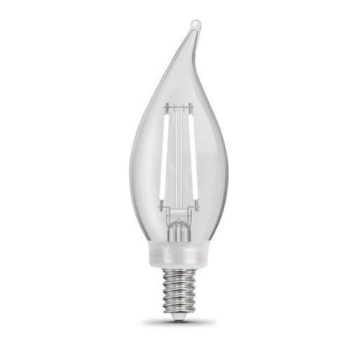 Upgrade your lighting to Feit Electric’s elegant Exposed White Filament LED Light Bulbs for a fresh take on decorative bulbs. These first-of-their-kind white filament bulbs take a traditional flame tip bulb with exposed filament encased in clear glass and add lower-profile white filaments. Unlike yellow filaments, these blend into your current décor, for a timeless look that complements any room. They give off a 5000K Daylight White glow ideal for craft rooms, bathrooms, kitchens, laundry rooms, utility rooms, and anywhere you desire invigorating light. Their bluish-white light is perfect for reading, working on intricate projects, and seeing fine details. These dimmable bulbs fit in any E12 Candelabra base such as chandeliers, wall sconces, pendant lights, and more. With a 90+ CRI, these bulbs make colors appear more vivid and true-to-life. The BPCFC60950CAWFIL/4 emits 500 lumens while only using 5.5 watts of electricity, up to 90.8% less energy than equivalent 60-watt incandescent bulbs. Get up to 15,000 hours/13.7 years of use (based on 3 hours per day use) with an estimated annual energy cost of only $0.66. Create a stylish feel that instantly enhances any home or commercial space.