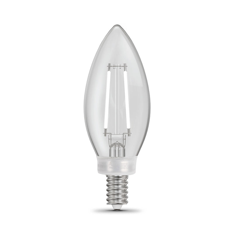 Upgrade your lighting to Feit Electric's elegant Exposed White Filament LED Light Bulbs for a fresh take on decorative bulbs. These first-of-their-kind white filament bulbs take a traditional torpedo tip bulb with exposed filament encased in clear glass and add lower-profile white filaments. Unlike yellow filaments, these blend into your current décor, for a timeless look that complements any room. They give off a 3500K True White glow ideal for craft rooms, offices, living spaces, and anywhere you desire balanced, neutral light. These dimmable bulbs fit in any E12 Candelabra base such as chandeliers, wall sconces, pendant lights, and more. With a 90+ CRI, these bulbs make colors appear more vivid and true-to-life. The CTC60935CAWFILHDRP/3 emits 500 lumens while only using 5.5 watts of electricity, up to 90.8% less energy than equivalent 60-watt incandescent bulbs. Get up to 15,000 hours/13.7 years of use (based on 3 hours per day use) with an estimated annual energy cost of only $0.66. Create a stylish feel that instantly enhances any home or commercial space.